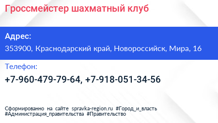 Гроссмейстер, шахматный клуб по адресу 353900, Краснодарский край, Новороссийск, Мира, 16 в дальнейшем Организация, размещена в следующих категориях: