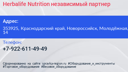 Herbalife Nutrition, независимый партнер по адресу 353925, Краснодарский край, Новороссийск, Молодёжная, 14 в дальнейшем Организация, размещена в следующих категориях: