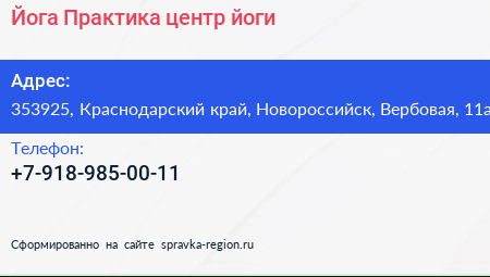 Йога Практика, центр йоги по адресу 353925, Краснодарский край, Новороссийск, Вербовая, 11а в дальнейшем Организация, размещена в следующих категориях: