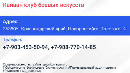 Кайван, клуб боевых искусств по адресу 353905, Краснодарский край, Новороссийск, Толстого, 4 в дальнейшем Организация, размещена в следующих категориях: