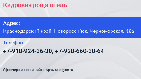 Кедровая роща, отель по адресу Краснодарский край, Новороссийск, Черноморская, 18а в дальнейшем Организация, размещена в следующих категориях: