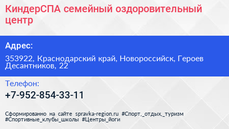 КиндерСПА, семейный оздоровительный центр по адресу 353922, Краснодарский край, Новороссийск, Героев Десантников, 22 в дальнейшем Организация, размещена в следующих категориях:
