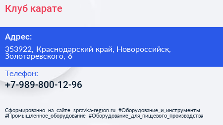 Клуб карате по адресу 353922, Краснодарский край, Новороссийск, Золотаревского, 6 в дальнейшем Организация, размещена в следующих категориях: