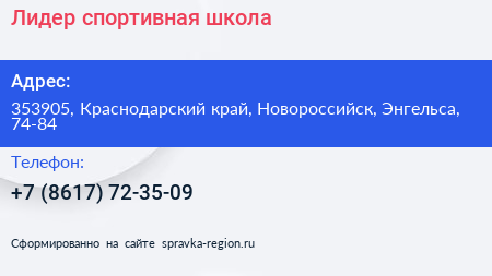 Лидер, спортивная школа по адресу 353905, Краснодарский край, Новороссийск, Энгельса, 74-84 в дальнейшем Организация, размещена в следующих категориях: