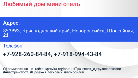 Любимый дом, мини-отель по адресу 353993, Краснодарский край, Новороссийск, Шоссейная, 21 в дальнейшем Организация, размещена в следующих категориях: