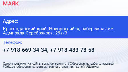 МАЯК по адресу Краснодарский край, Новороссийск, набережная им. Адмирала Серебрякова, 29а/3 в дальнейшем Организация, размещена в следующих категориях: