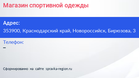 Магазин спортивной одежды по адресу 353900, Краснодарский край, Новороссийск, Бирюзова, 3 в дальнейшем Организация, размещена в следующих категориях: