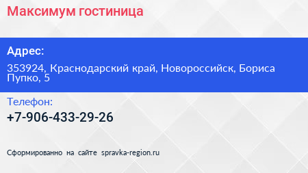 Максимум, гостиница по адресу 353924, Краснодарский край, Новороссийск, Бориса Пупко, 5 в дальнейшем Организация, размещена в следующих категориях: