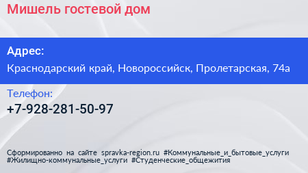 Мишель, гостевой дом по адресу Краснодарский край, Новороссийск, Пролетарская, 74а в дальнейшем Организация, размещена в следующих категориях: