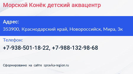 Морской Конёк, детский аквацентр по адресу 353900, Краснодарский край, Новороссийск, Мира, 3к в дальнейшем Организация, размещена в следующих категориях: