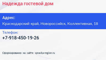 Надежда, гостевой дом по адресу Краснодарский край, Новороссийск, Коллективная, 18 в дальнейшем Организация, размещена в следующих категориях: