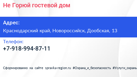 Не Горюй!, гостевой дом по адресу Краснодарский край, Новороссийск, Дообская, 13 в дальнейшем Организация, размещена в следующих категориях: