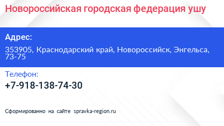Новороссийская городская федерация ушу по адресу 353905, Краснодарский край, Новороссийск, Энгельса, 73-75 в дальнейшем Организация, размещена в следующих категориях: