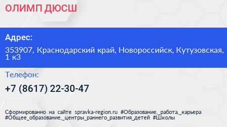ОЛИМП, ДЮСШ по адресу 353907, Краснодарский край, Новороссийск, Кутузовская, 1 к3 в дальнейшем Организация, размещена в следующих категориях: