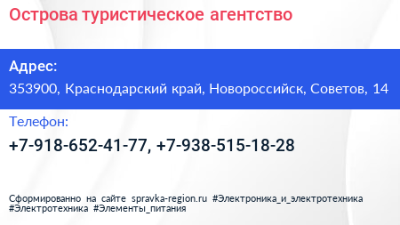 Острова, туристическое агентство по адресу 353900, Краснодарский край, Новороссийск, Советов, 14 в дальнейшем Организация, размещена в следующих категориях: