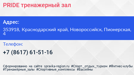 PRIDE, тренажерный зал по адресу 353918, Краснодарский край, Новороссийск, Пионерская, 4 в дальнейшем Организация, размещена в следующих категориях: