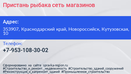 Пристань рыбака, сеть магазинов по адресу 353907, Краснодарский край, Новороссийск, Кутузовская, 10 в дальнейшем Организация, размещена в следующих категориях: