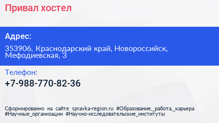 Привал, хостел по адресу 353906, Краснодарский край, Новороссийск, Мефодиевская, 3 в дальнейшем Организация, размещена в следующих категориях:
