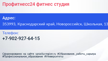 Профитнесс24, фитнес-студия по адресу 353993, Краснодарский край, Новороссийск, Школьная, 13 в дальнейшем Организация, размещена в следующих категориях: