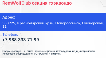 RemWolfClub, секция тхэквондо по адресу 353925, Краснодарский край, Новороссийск, Пионерская, 11 в дальнейшем Организация, размещена в следующих категориях: