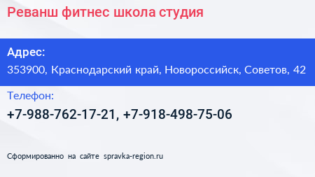 Реванш, фитнес-школа студия по адресу 353900, Краснодарский край, Новороссийск, Советов, 42 в дальнейшем Организация, размещена в следующих категориях: