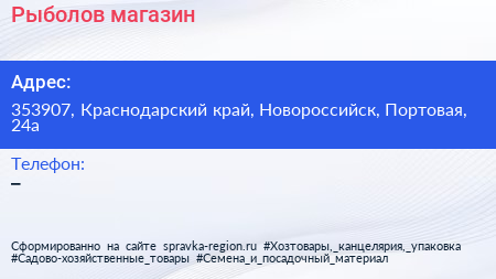 Рыболов, магазин по адресу 353907, Краснодарский край, Новороссийск, Портовая, 24а в дальнейшем Организация, размещена в следующих категориях:
