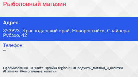 Рыболовный магазин по адресу 353923, Краснодарский край, Новороссийск, Снайпера Рубахо, 42 в дальнейшем Организация, размещена в следующих категориях: