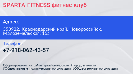 SPARTA-FITNESS, фитнес-клуб по адресу 353922, Краснодарский край, Новороссийск, Малоземельская, 15а в дальнейшем Организация, размещена в следующих категориях: