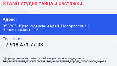 STAND, студия танца и растяжки по адресу 353905, Краснодарский край, Новороссийск, Черняховского, 15 в дальнейшем Организация, размещена в следующих категориях: