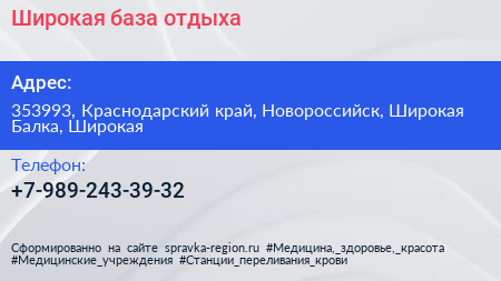 Широкая, база отдыха по адресу 353993, Краснодарский край, Новороссийск, Широкая Балка, Широкая в дальнейшем Организация, размещена в следующих категориях: