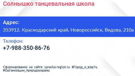 Солнышко, танцевальная школа по адресу 353912, Краснодарский край, Новороссийск, Видова, 210а в дальнейшем Организация, размещена в следующих категориях:
