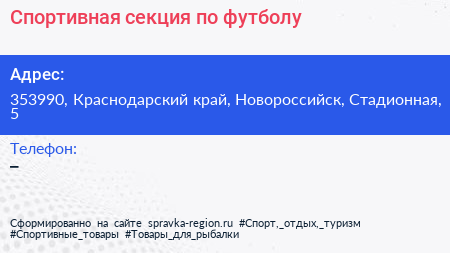 Спортивная секция по футболу по адресу 353990, Краснодарский край, Новороссийск, Стадионная, 5 в дальнейшем Организация, размещена в следующих категориях: