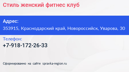 Стиль, женский фитнес-клуб по адресу 353915, Краснодарский край, Новороссийск, Уварова, 30 в дальнейшем Организация, размещена в следующих категориях: