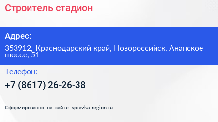 Строитель, стадион по адресу 353912, Краснодарский край, Новороссийск, Анапское шоссе, 51 в дальнейшем Организация, размещена в следующих категориях: