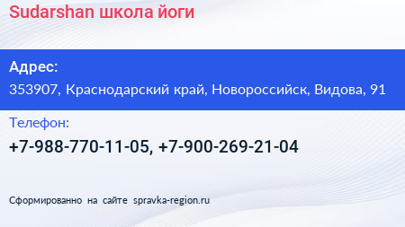 Sudarshan, школа йоги по адресу 353907, Краснодарский край, Новороссийск, Видова, 91 в дальнейшем Организация, размещена в следующих категориях:
