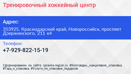 Тренировочный хоккейный центр по адресу 353925, Краснодарский край, Новороссийск, проспект Дзержинского, 211 к4 в дальнейшем Организация, размещена в следующих категориях: