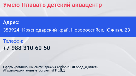 Умею Плавать, детский аквацентр по адресу 353924, Краснодарский край, Новороссийск, Южная, 23 в дальнейшем Организация, размещена в следующих категориях: