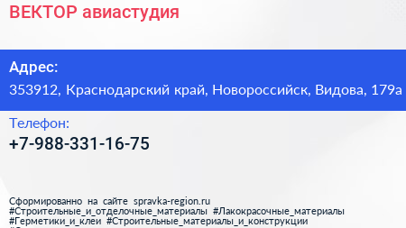 ВЕКТОР, авиастудия по адресу 353912, Краснодарский край, Новороссийск, Видова, 179а в дальнейшем Организация, размещена в следующих категориях: