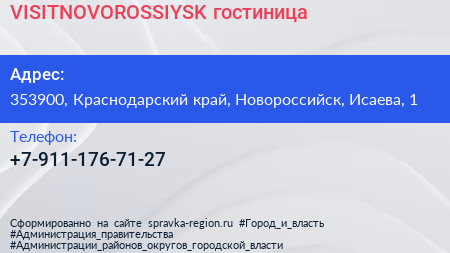 VISITNOVOROSSIYSK, гостиница по адресу 353900, Краснодарский край, Новороссийск, Исаева, 1 в дальнейшем Организация, размещена в следующих категориях: