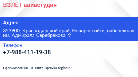 ВЗЛЁТ, авиастудия по адресу 353900, Краснодарский край, Новороссийск, набережная им. Адмирала Серебрякова, 9 в дальнейшем Организация, размещена в следующих категориях: