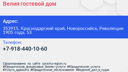 Велия, гостевой дом по адресу 353915, Краснодарский край, Новороссийск, Революции 1905 года, 53 в дальнейшем Организация, размещена в следующих категориях: