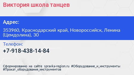 Виктория, школа танцев по адресу 353960, Краснодарский край, Новороссийск, Ленина (Цемдолина), 30 в дальнейшем Организация, размещена в следующих категориях: