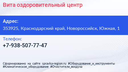 Вита, оздоровительный центр по адресу 353925, Краснодарский край, Новороссийск, Южная, 1 в дальнейшем Организация, размещена в следующих категориях: