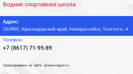Водник, спортивная школа по адресу 353905, Краснодарский край, Новороссийск, Толстого, 4 в дальнейшем Организация, размещена в следующих категориях: