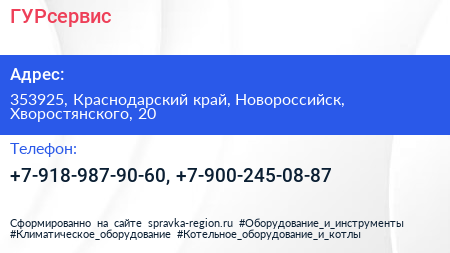 ГУРсервис по адресу 353925, Краснодарский край, Новороссийск, Хворостянского, 20 в дальнейшем Организация, размещена в следующих категориях: