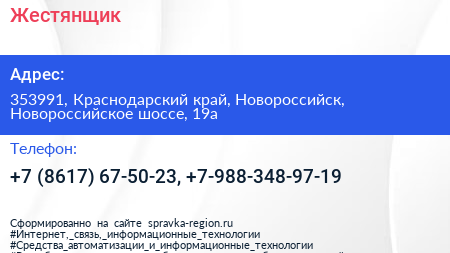 Жестянщик по адресу 353991, Краснодарский край, Новороссийск, Новороссийское шоссе, 19а в дальнейшем Организация, размещена в следующих категориях: