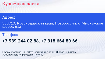 Кузнечная лавка по адресу 353919, Краснодарский край, Новороссийск, Мысхакское шоссе, 61а в дальнейшем Организация, размещена в следующих категориях: