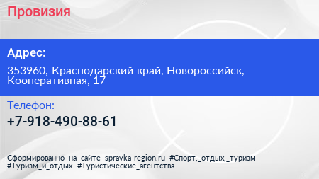 Провизия по адресу 353960, Краснодарский край, Новороссийск, Кооперативная, 17 в дальнейшем Организация, размещена в следующих категориях: