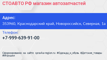 СТОАВТО.РФ, магазин автозапчастей по адресу 353960, Краснодарский край, Новороссийск, Северная, 1а в дальнейшем Организация, размещена в следующих категориях: