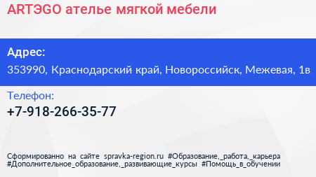 ARTЭGO, ателье мягкой мебели по адресу 353990, Краснодарский край, Новороссийск, Межевая, 1в в дальнейшем Организация, размещена в следующих категориях: